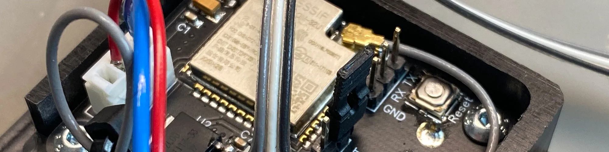 Andrew designed a small PCB which includes the ESP32 module, power regulation, a USB socket and connectors for the sensor, USB pass-through, an expansion header and a programming header.