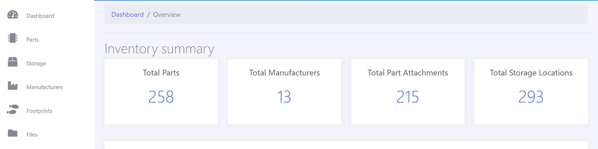 The Dashboard gives you an overview of the system with totals for Parts, Manufacturers, Attachments and Storage Locations. It also lists any parts which have less than your low stock level available.