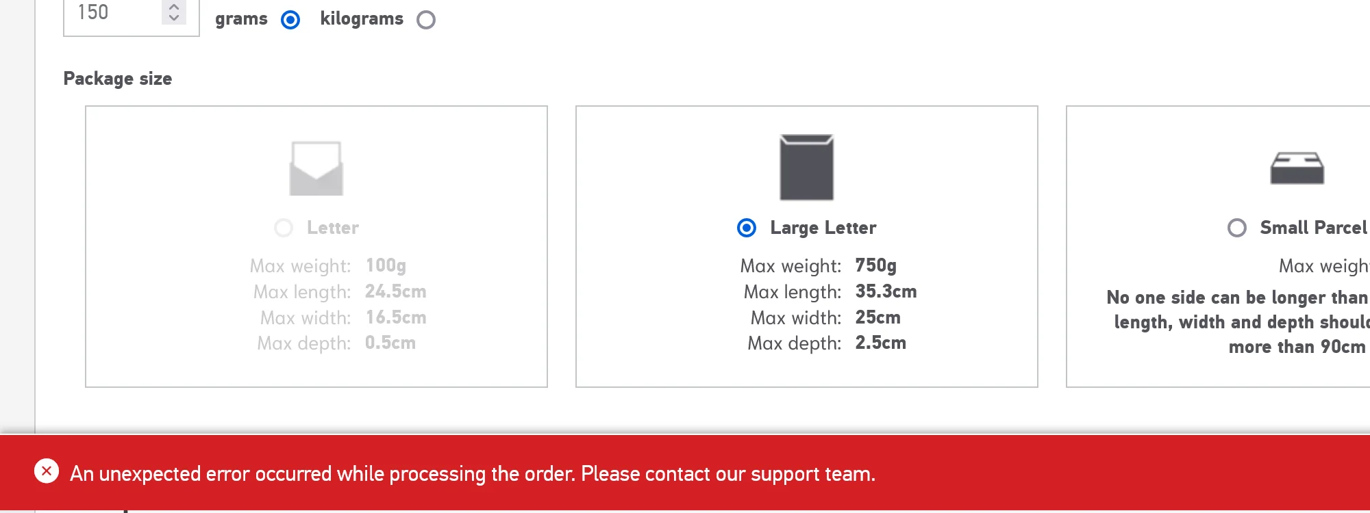 The error message stated: “An unexpected error occurred while processing the order. Please contact our support team.”